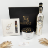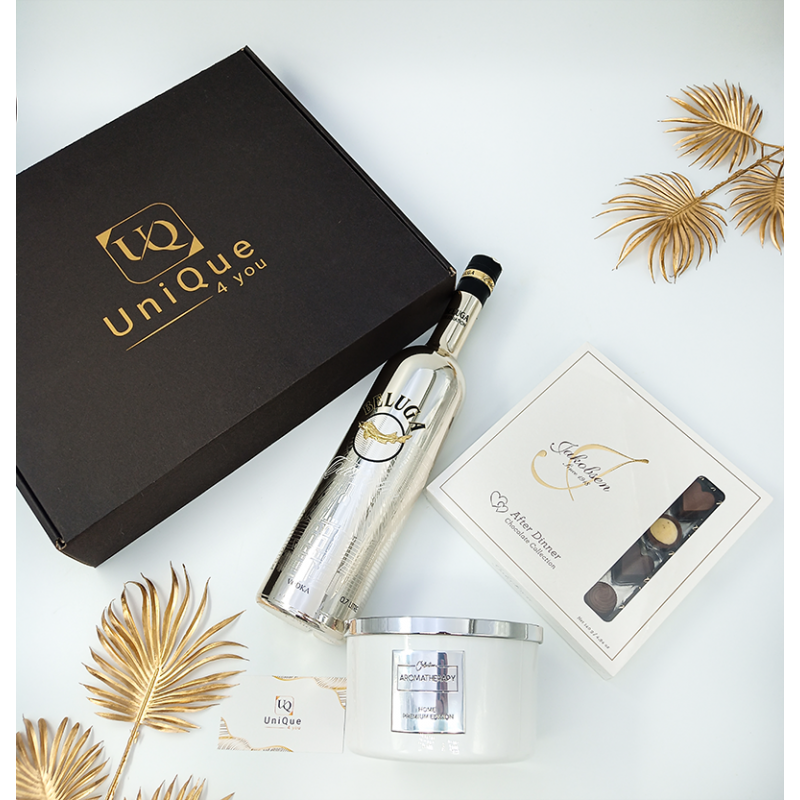 Gift Box luxury, în cutie elegantă personalizată cu logo UniQue4you, format din Beluga Celebration vodka, Iakobsen After Dinner-colectie de praline umplute cu ciocolata si lumanare parfumata eleganta cu capac. Un cadou versatil potrivit atat pentru doamne cat si pentru domni in special cu ocazia celebrarii zilei de nastere sau onomasticii.