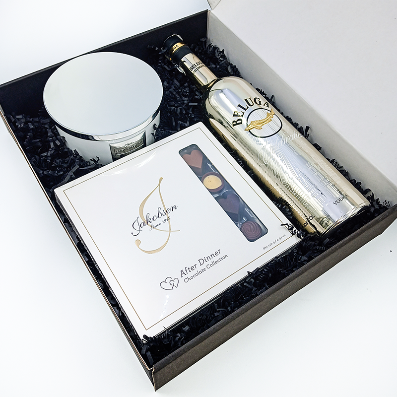 Gift Box elegant cu vodka Beluga Celebration, praline de ciocolata Iakobsen si lumanare parfumata cu capac.