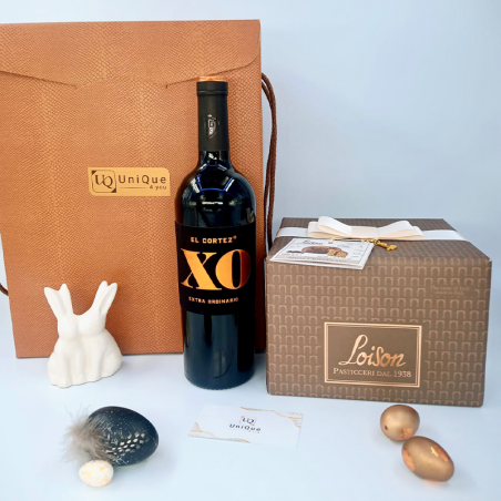 Gift Box elegant în tematică Pascală cu panettone Loison si vin rosu premium El Cortez XO Extra Ordinario