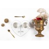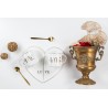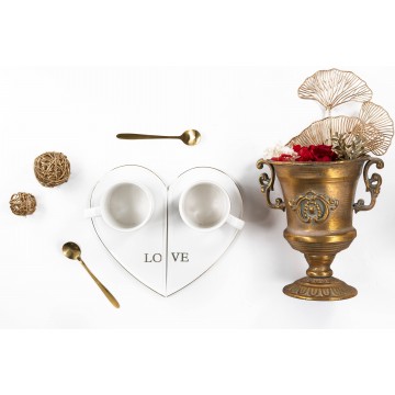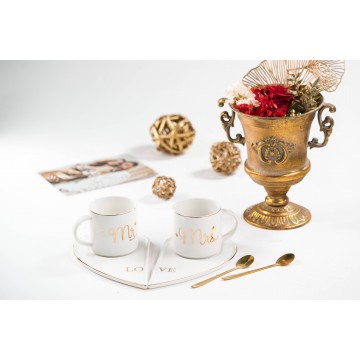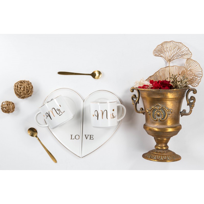 Set inima format din 2 farfurii jumatati de inima si 2 cani,albe cu accente aurii, inscriptionate cu ''Mr'' si "Mrs" si 2 lingurite lungi din inox aurit.