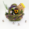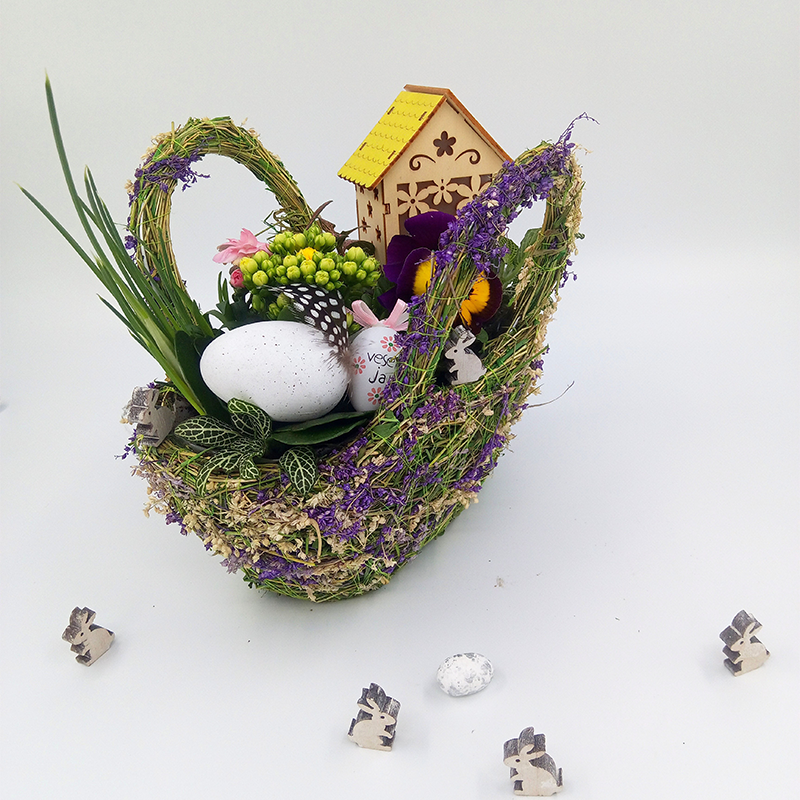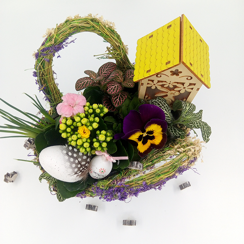 Aranjament in tematica pascala format din plante naturale de gradina (panseluta, kalanchoe galbena, dianthus garofite, fittonia zebrano, fittonia argyroneura, bulbi iris), casuta decorativa, model pascal, cu led, iepurasi din lemn si oua-ornamente pentru Paste, in ghiveci tip cosulet din sarma imbracat in plante naturale uscate.