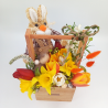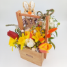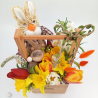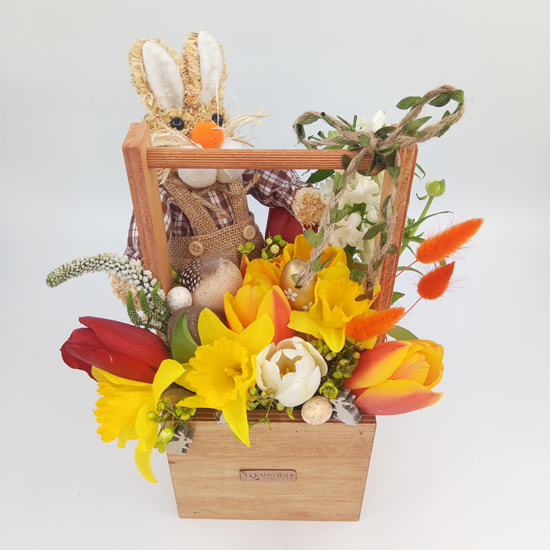 Aranjament in tematica pascala format din lalele, zambile, narcise, lagurus, ranunculus, chamelaucium, iepure din paie si oua ornament pentru Paste, in ghiveci tip cub din lemn cu maner inalt rotunjit, nuanta nature, accesorizat cu funda din sfoara si frunze din satin, personalizat cu placuta Abs cu gravura laser cu logo UniQue4You.