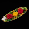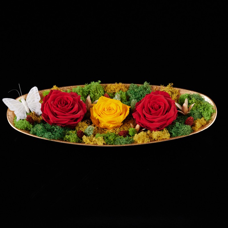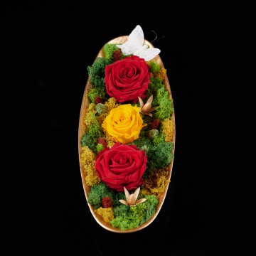 Această corabie elegantă, aurie, din răşină, cu licheni stabilizaţi în nuanţă de verde şi trandafiri criogenaţi în nuanţe de roşu şi galben, este decorul perfect de pe masuţa de cafea din living, de pe noptieră sau de pe birou.