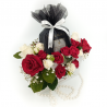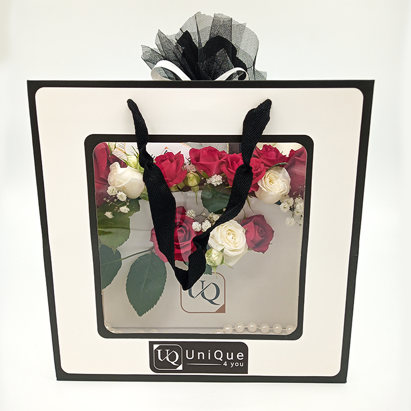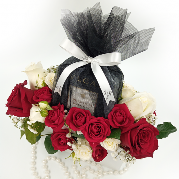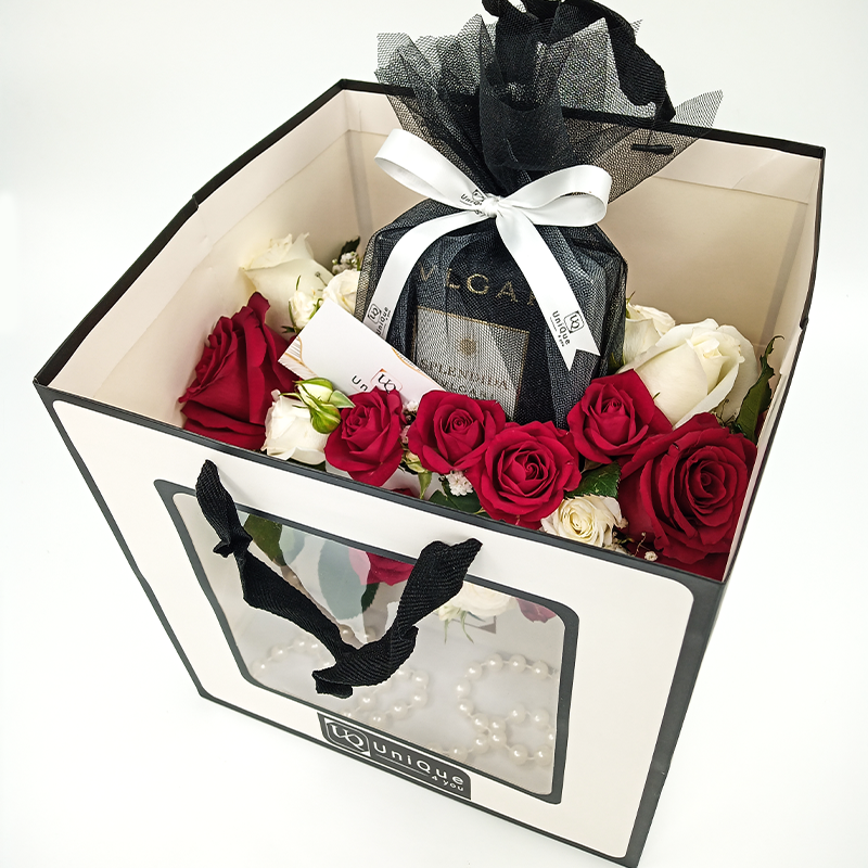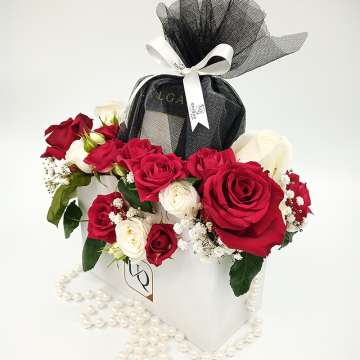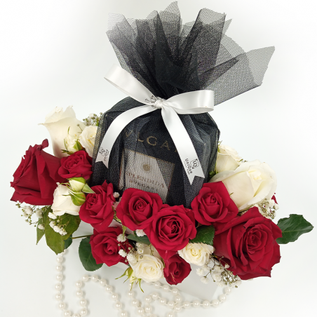 Aranjament luxuriant in poseta alba din carton dur,cu toarta din perle albe ,format din minirose,trandafiri naturali rosii si albi si parfum Bvlgari Splendida in ambalaj unic si personalizat UniQue4You.