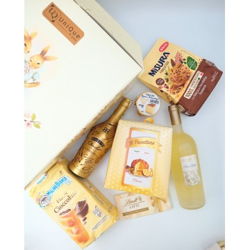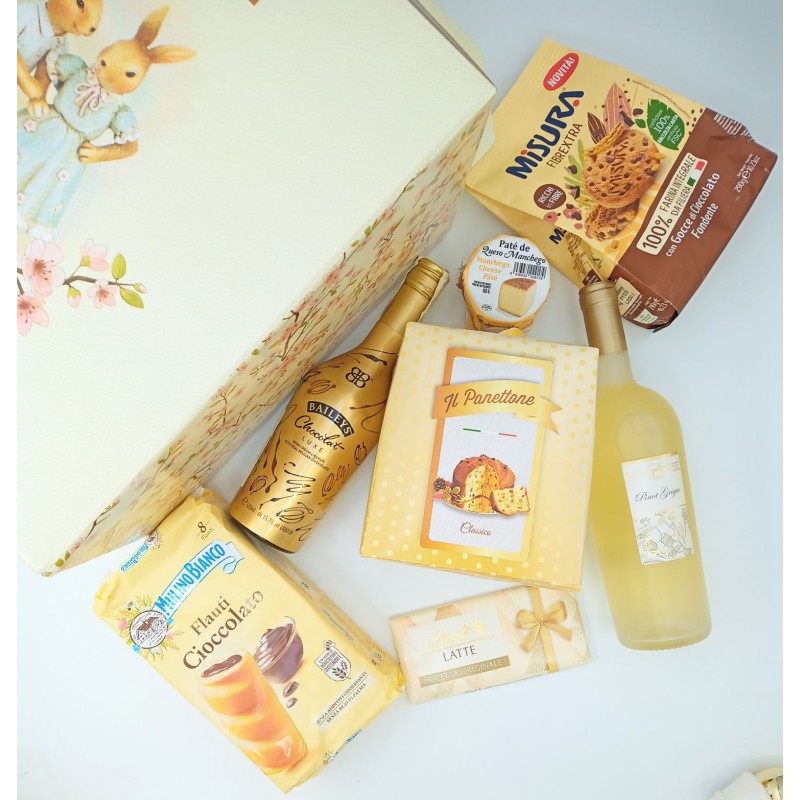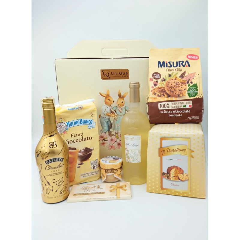 Gift Box pentru Paște format din biscuiți cu fibre și ciocolată fondantă Misura, Panettone Clasic cu stafide Flowpack-Gold Box, Lindt-tabletă de ciocolată cu lapte, Mulino Bianco-prajitură cu cremă de ciocolată, Pinot Grigio Tenuta Ulisse-vin alb, cremă de brânză Manchego din lapte de oaie (rasa Manchego din regiunea spaniolă La Mancha), o cremă de brânză ce poate fi preparată în zeci de feluri sau poate fi savurată pe pâine prăjită sau crackers și Baileys-lichior de ciocolată, ambalate in cutie din carton dur cu motive Pascale, personalizată cu logo UniQue4You.
